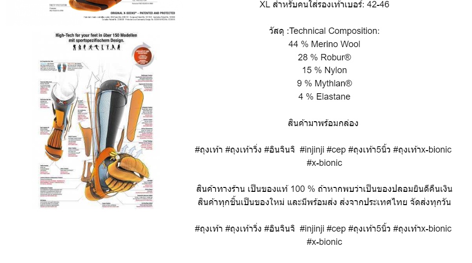 ถุงเท้าเดินป่า ลดแรงกระแทก ลดการเสียดสี ระบายอากาศได้ดี ของแท้ พร้อมส่ง X-BIONIC ของแบรนด์ X-SOCKS ยอดถุงเท้ากีฬาจากสวิสเซอร์แลนด์ ความเจ๋งของถุงเท้าแบรนด์นี้เริ่มตั้งแต่การใช้เส้นใยคุณภาพสูงมาถักทอ ผสานกับการออกแบบถุงเท้าด้วยเทคโนโลยีเฉพาะตัวมากมายที่ใส่เข้าไป อาทิ Air-Conditioning Channel® การทอที่เว้นร่องพิเศษสำหรับช่วยระบายอากาศได้ดียิ่งขึ้น, X-Cross® Bandage การทอผ้าชิ้นพิเศษรูปตัว X ที่ผสานวัสดุมีความยืดหยุ่นสูงช่วยปกป้องบริเวณข้อเท้าไม่ให้เกิดอันตรายได้เป็นอย่างดี, Traverse AirFlow Channel System™ นอกจากการทอที่เว้นร่องพิเศษสำหรับช่วยระบายอากาศได้ดียิ่งขึ้นแล้วก็ยังออกแบบวางร่องนี้เพื่อนำอากาศดีไหลเวียนเข้าไปเพื่อไม่ให้เท้าอับชื้น แถมยังเย็นเท้าอยู่ตลอดเวลา รู้สึกสบายในการออกกำลังกาย, Self-adjusting cuff (Socks) แถบรัดเท้าที่ได้รับการออกแบบมาเป็นพิเศษ ยืดหยุ่น กระชับ ไม่รัดเน่นหรือหลวมจนเกินไป ปรับอัตโนมัติตามขนาดของขา เป็นต้น นี่เป็นเพียงแค่ตัวอย่างของเทคโนโลยีต่างๆ ที่บรรจุเข้าไปในถุงเท้านี้เพื่อให้ได้ถุงเท้าที่ออกมามีประสิทธิภาพสูงสุดต่อการออกกำลังกายของเรา ที่สำคัญเจ้า X-BIONIC ยังกวาดรางวัลมาแล้วมากมายหลายเวทีใหญ่ๆ ของโลกรวมถึงเวทีล่าสุดอย่าง IDEE-SUISSE ของ Swiss Association for Ideas and Innovation Management สำหรับใส่เดินป่า หรือเดินท่องเที่ยวระยะทางไกล ออกแบบพิเศษช่วยกระตุ้นการไหลเวียนของเลือดในกล้ามเนื้อแน่นกระชับเหมาะสมกับสรีระของผู้สวมใส่ ตะเข็บนิ้วเท้าแน่นหนาเป็นพิเศษฟื้นฟูและเพิ่มประสิทธิภาพให้กับการเดินเป็นเวลานานๆ สำหรับกล้ามเนื้อและข้อต่อเพื่อช่วยป้องกันการบาดเจ็บ ระบบการระบายอากาศที่ดีเยี่ยม ไซส์ : L สำหรับคนใส่รองเท้าเบอร์: 39-41 XL สำหรับคนใส่รองเท้าเบอร์: 42-46 วัสดุ :Technical Composition: 44 % Merino Wool 28 % Robur® 15 % Nylon 9 % Mythlan® 4 % Elastane สินค้ามาพร้อมกล่อง ถุงเท้าออกกำลังกาย ถุงเท้าวิ่งเทรล ถุงเท้าวิ่งมาราธอน ถุงเท้า Cep สินค้ามีพร้อมส่ง จัดส่งทุกวัน #ถุงเท้า #ถุงเท้าวิ่ง #อินจินจิ #injinji #cep #ถุงเท้า5นิ้ว #ถุงเท้าx-bionic #x-bionic สินค้าทางร้าน เป็นของแท้ 100 % ถ้าหากพบว่าเป็นของปลอมยินดีคืนเงิน สินค้าทุกชิ้นเป็นของใหม่ และมีพร้อมส่ง ส่งจากประเทศไทย จัดส่งทุกวันผ่านไปรษณีย์ และ Kerry ![]() ![]() ![]() ![]() ![]() ![]() ![]() ![]() ![]() ![]() ![]() |